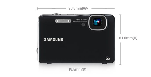 Special Feature   Waterproof & Compact slim Design Waterproof (3M), Aqua Mode 12 Mege Pixels 5X Optical Zoom Lens & DIS 2.7" LCD (230K) H.264, 720p, 30fps ISO 3,200 Smart Auto (Still & Movie) & Face Recognition Face Detection & Self Portrait Smart Album Blink Detection & Smile Detection Beauty Shot Frame Guide Function Description Smart Filter: Miniature, Vignetting, Fish Eye
