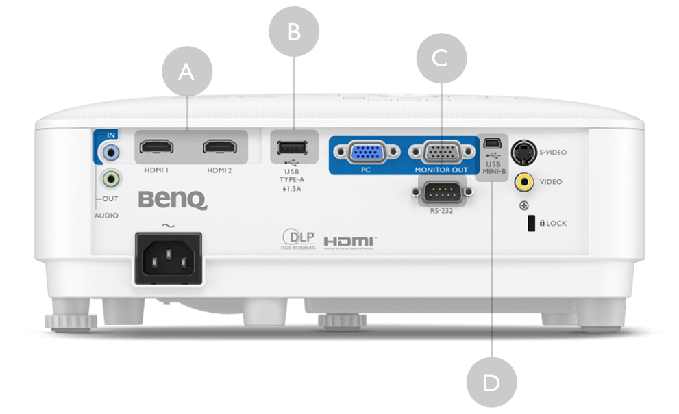 Designed to secure tabletop projectors, the Kensington lock interface provides physical security.