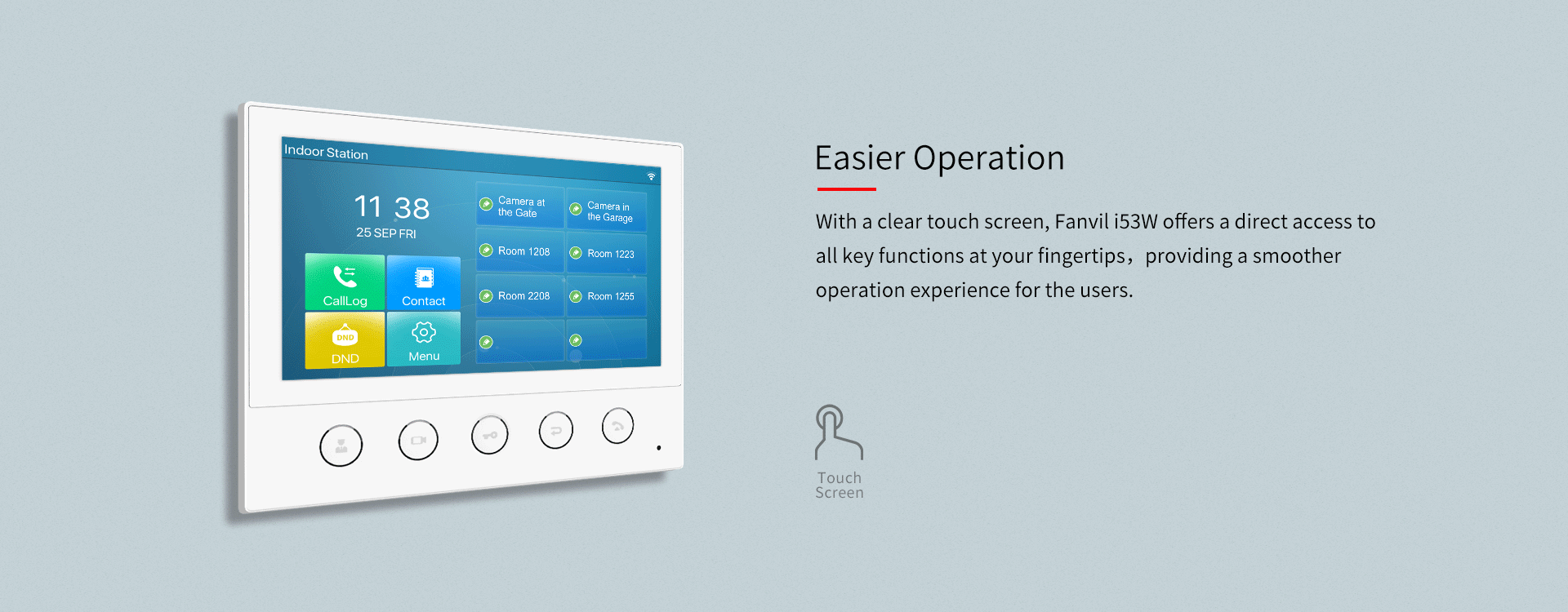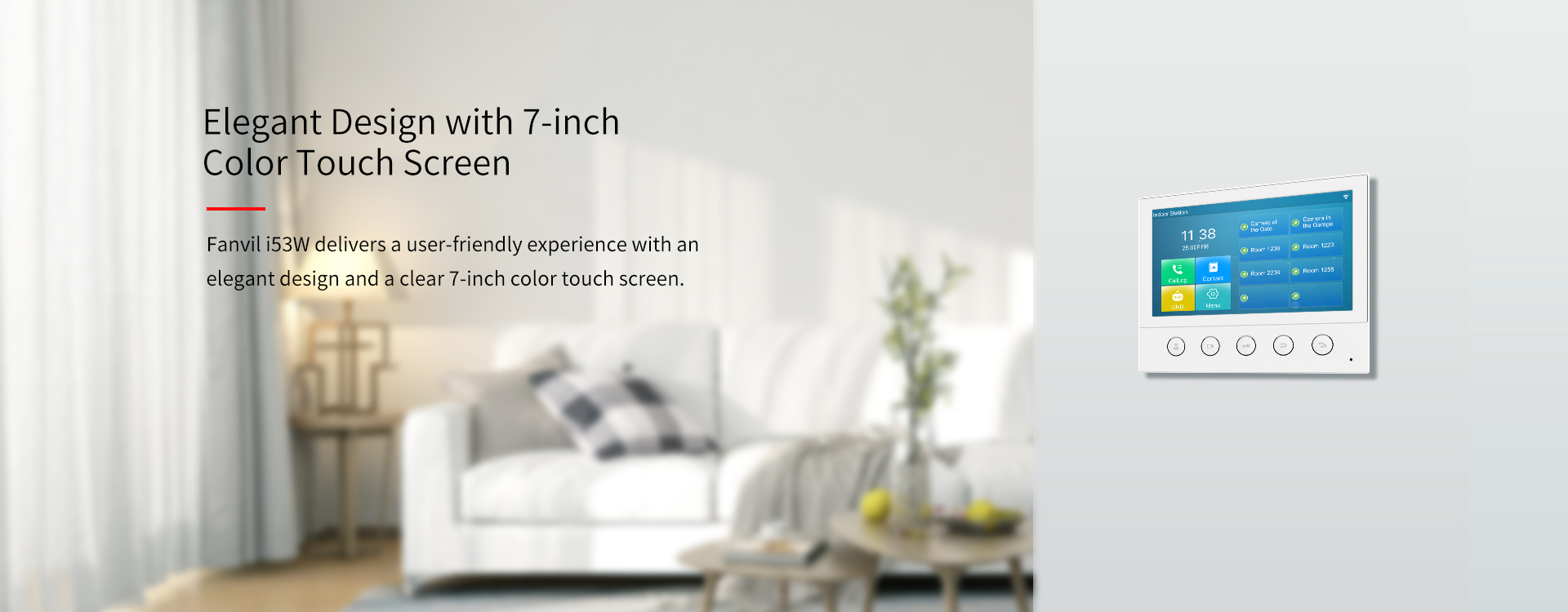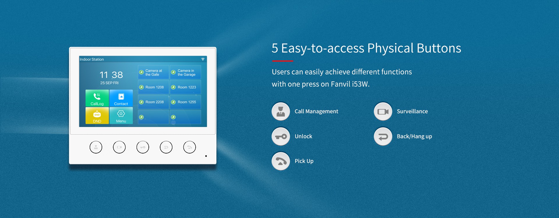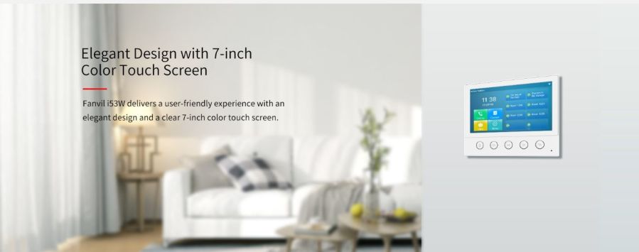 Fanvil i53W is a 7-inch color touch screen SIP indoor station with 5 function buttons, which can be applied in different indoor scenarios. Working with door phone and intercom at the entrance, Fanvil i53W can be easily achieved remote access control for residences. It can also be connected to alarms and other intelligent security devices via rich interfaces.