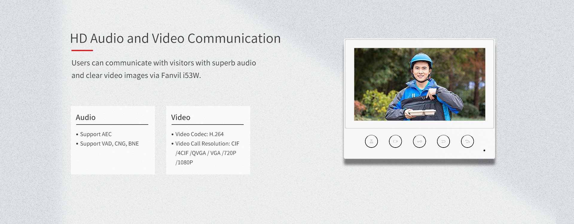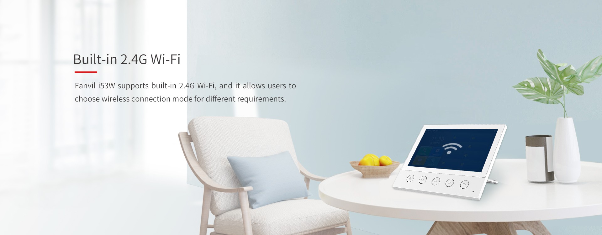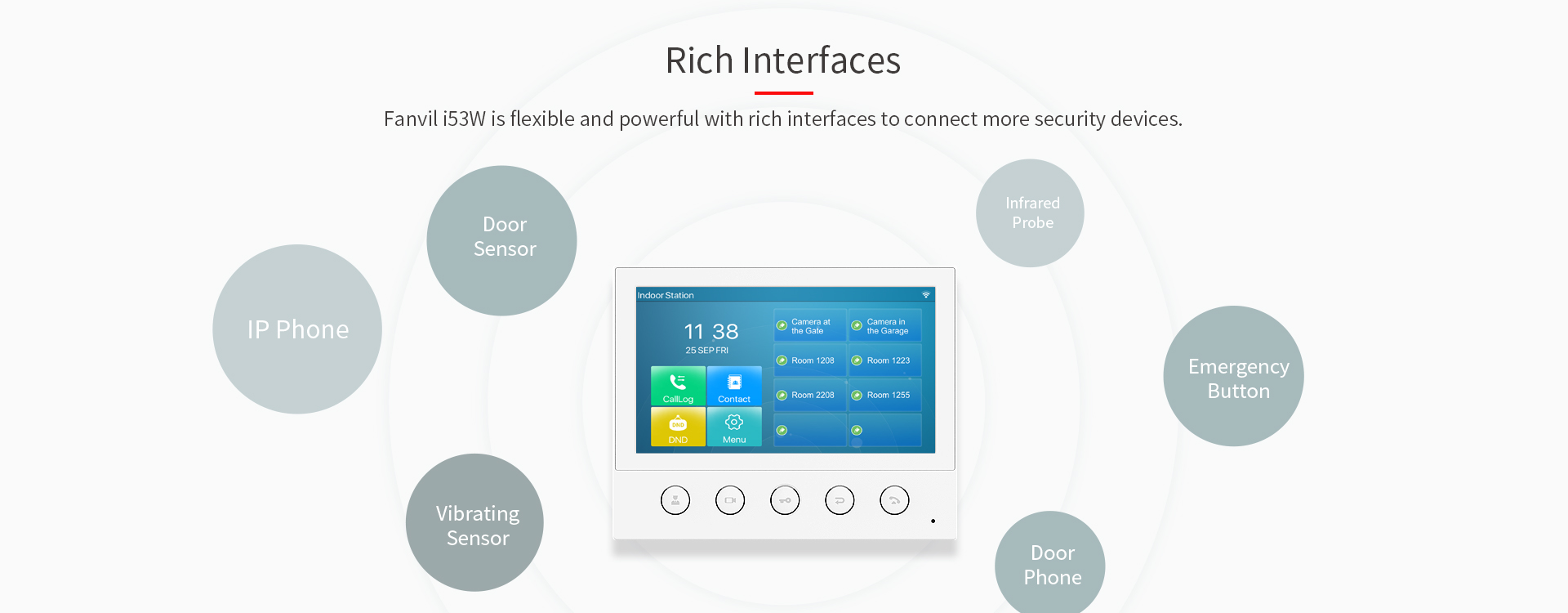 Fanvil i53W is a 7-inch color touch screen SIP indoor station with 5 function buttons, which can be applied in different indoor scenarios. Working with door phone and intercom at the entrance, Fanvil i53W can be easily achieved remote access control for residences. It can also be connected to alarms and other intelligent security devices via rich interfaces.