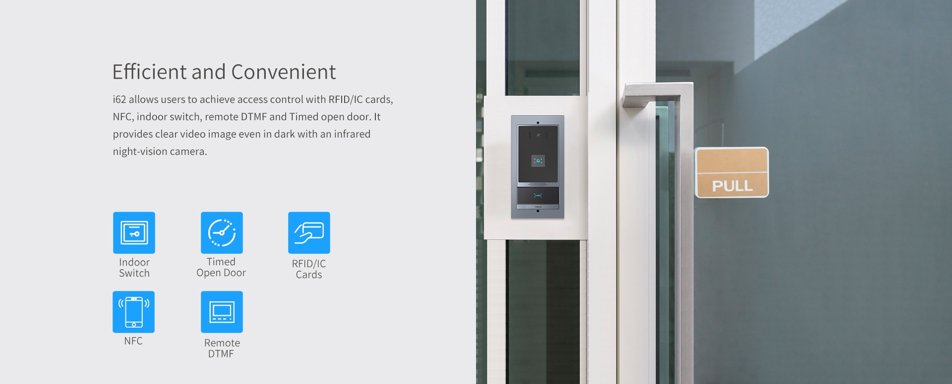 Based on SIP and ONVIF protocols, i62 is a video door phone that integrates powerful functionalities of access control, intercom, and security protection. Featuring an aluminum alloy design and single speed-dial button, i62 delivers a high-quality elegant appearance. With high protection level IP66 and IK07, it is waterproof, dustproof and anti-collision in most outdoor environments. i62 allows users to make audio/video calls via a speed-dial button and a 2 Mega-pixel camera and achieve access control by different modes. With rich input and output interfaces, i62 is easy to link with other security devices and customize into various solutions in apartments, commercial buildings, communities and industrial parks.