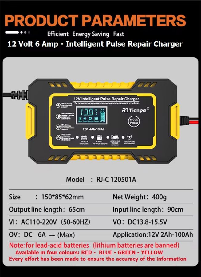 544243, Generic Battery Charger with Pulse Repair Lead acid type 12V 6A Yellow $26.60