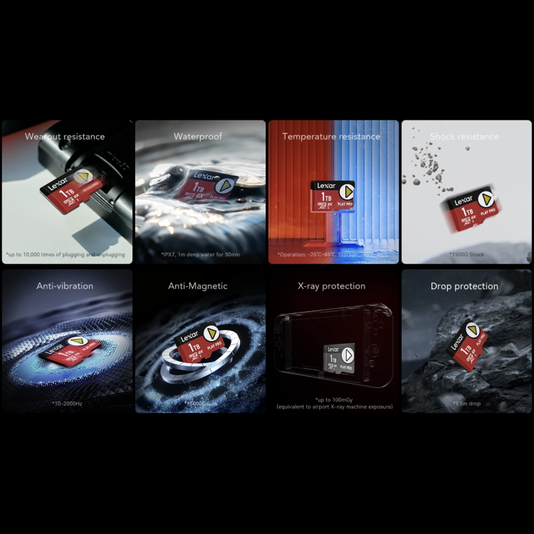 The PLAY PRO microSD Express card is IPX7 waterproof, wearproof, temperature-proof, x-ray-proof, vibration-resistant, magnetic-proof, shockproof, and drop-proof.3
